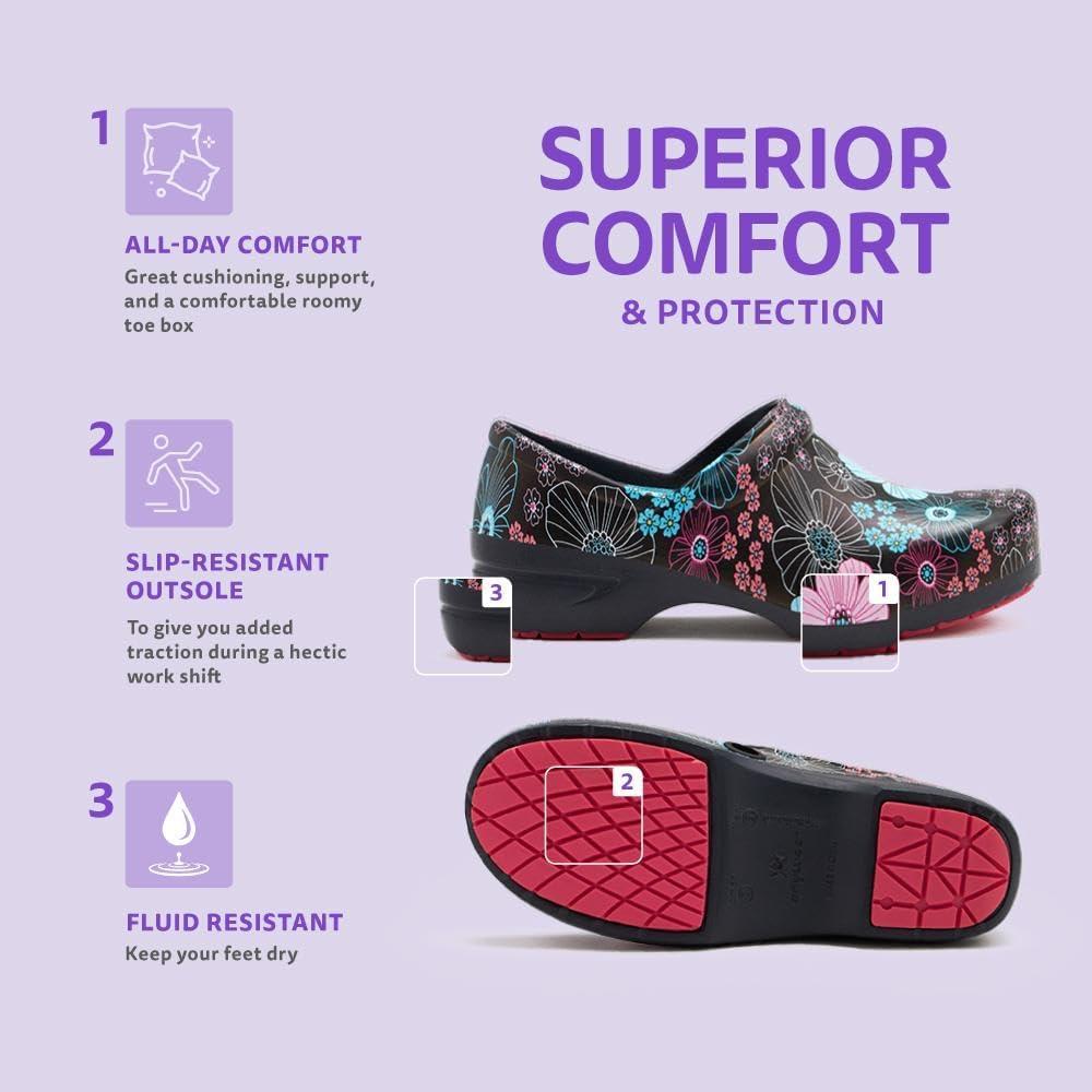 Anywear SR Angel nursing clogs are the ultimate choice for those in need of reliable and stylish footwear. Designed for healthcare workers, chefs, and anyone on their feet all day, these clogs offer the perfect blend of comfort, durability, and style. As fall approaches, step confidently into these non slip work shoes for women, ideal for navigating slippery surfaces with their slip-resistant outsole. These versatile work clogs are perfect for busy hospital corridors or bustling restaurant kitchens. Constructed with lightweight, shock-absorbing EVA material, they provide all-day comfort you can rely on. The roomy toe box and exceptional cushioning ensure your feet stay comfortable during long shifts, while ventilation holes promote breathability, reducing sweat as you move through your day. Capable of accommodating both men and women, the Anywear SR Angel clogs cater to a variety of professionals seeking non slip shoes for women that are practical yet expressive. Available in vibrant colors and fun prints, these clogs allow you to showcase your unique style at work. Care for your clogs is simple. With easy maintenance in mind, these nurse shoes for women comfortable are designed for quick cleaning. Just hand wash with soap and water and let them air dry. For best results, avoid exposing them to extreme heat, which can warp the material. Whether you're in healthcare, culinary fields, or any profession requiring long hours on your feet, the Anywear SR Angel clogs are your go-to solution for slip-resistant safety and all-day comfort. Move confidently through your day with footwear that's as hardworking as you are.